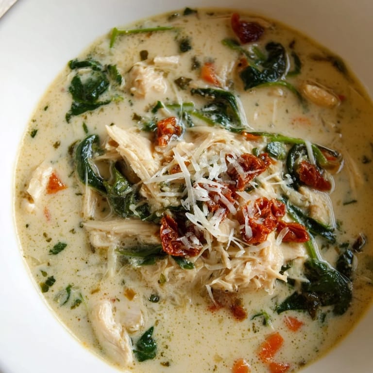 Save to Pinterest The first spoonful caught me off guard—I'd thrown together leftover chicken with whatever looked good in the fridge, and somehow it tasted like I'd spent hours planning. The spinach wilted into the cream just as the sun-dried tomatoes released their sweet, tangy oil, and I realized I'd stumbled onto something I'd want to make on repeat. My kitchen smelled like a trattoria I'd never visited, and I was already thinking about who I'd make it for next. That's how this soup earned its place in my weekly rotation. Sometimes the best recipes aren't planned; they just happen on a Tuesday night when you're hungry and hopeful.